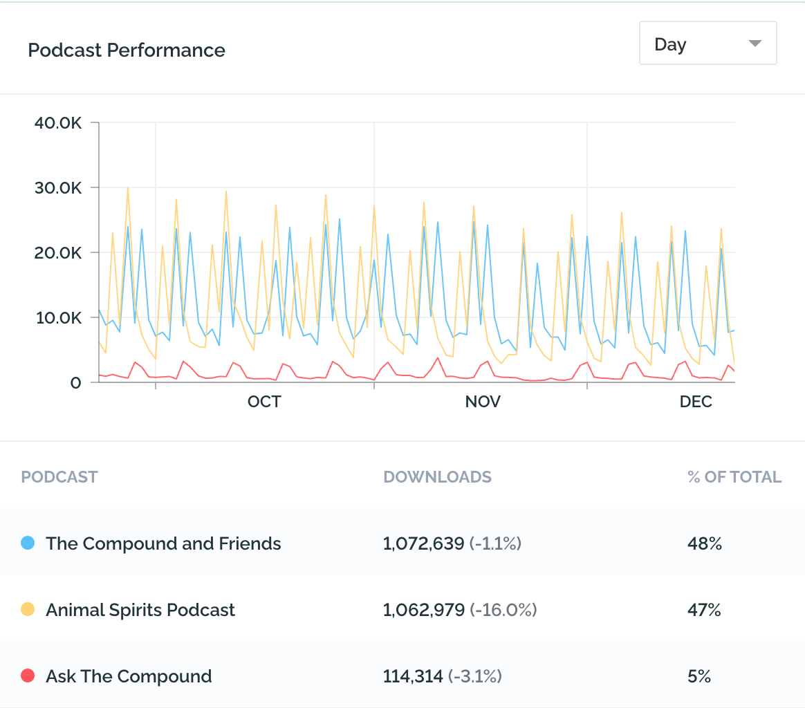 Over the last 90 days, over a million downloads for The Compound and Friends, over a million downloads for our sister show (brother show?) Animal Spirits and another 100,000+ for our newest network show, Ask the Compound, where Ben Carlson and Duncan Hill take your questions and bring in experts to help answer them each week.