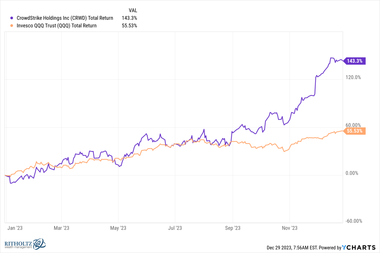 In 2023, CrowdStrike’s stock price was up about 150%. It was the third best performing stock in the Nasdaq 100 (behind only Nvidia and Meta this year) and the thirteenth best performer in the entire Russell 1000.
