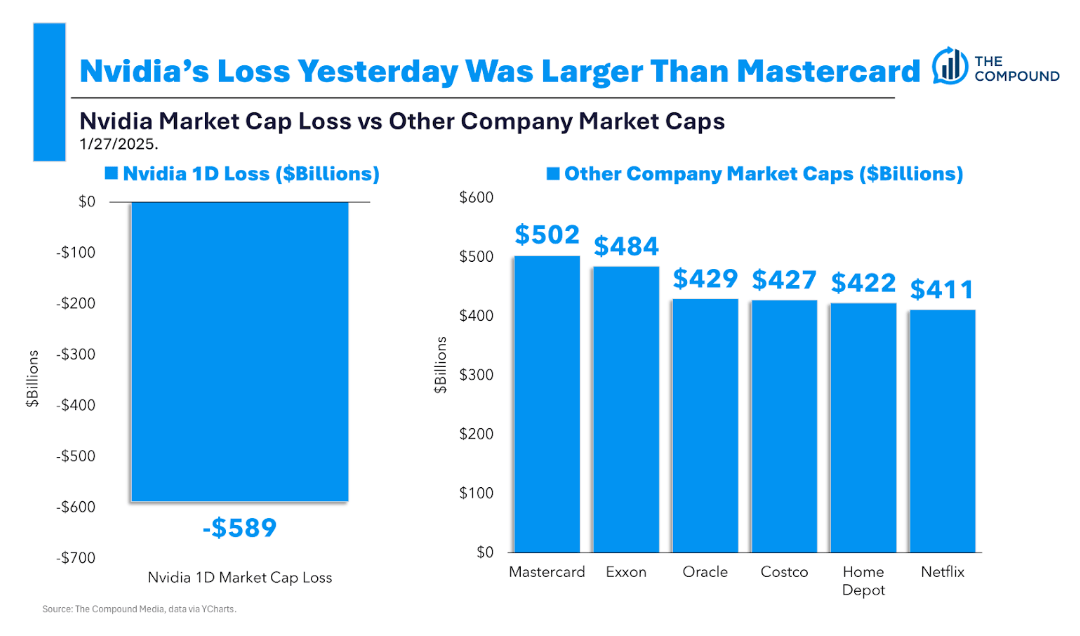 Nvidia’s drop on Monday - $589 billion - was the largest dollar-figure market cap loss of all time, for any company, on any stock market around the world. Nvidia now holds eight of the top ten of these records.