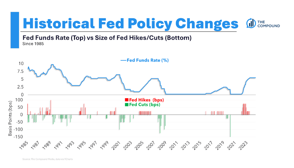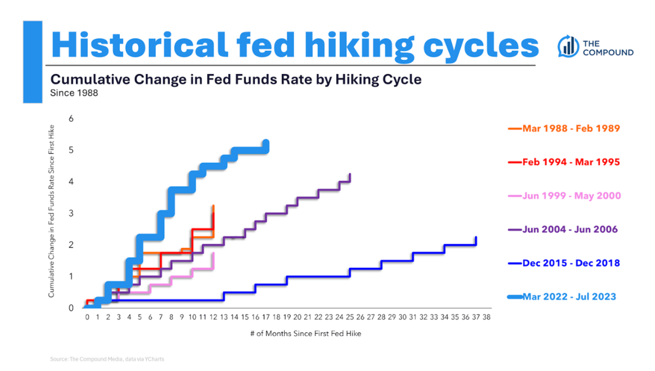 That thick blue line above represents the current rate hike cycle and it truly stands out in terms of the speed and magnitude of the hikes. We’ve been through quite a bit of tightening and the market / economy has held up throughout. We’ve had a few corrections and a notable cyclical bear market since it started, but earnings growth has resumed and valuations have hung in there. It’s been thirteen months of 5.25% Fed Funds rates since the Fed stopped tightening in July of 2023.