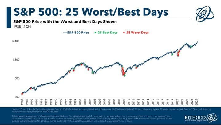 Callie and Matt put this together for our advisors and their clients. I thought it was a great illustration about the nature of brutal sell-offs - they tend to be accompanies by huge up-days like the one we had yesterday. This is neither good nor bad, it just is. Which means missing the worst days - even if you could - would also probably mean missing the best days, because of how clustered together they typically are.