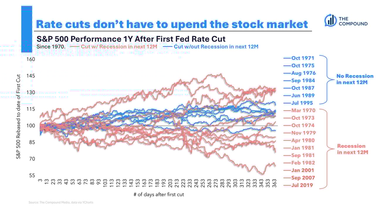 One more chart we’ve used before - not every cut is followed by a recession, not every recession is accompanied by a brutal bear market. The chart below doesn’t predict anything about this cycle. It’s meant to demonstrate the range of potential outcomes so that you aren’t led astray by the last talking head you hear commenting on the subject.