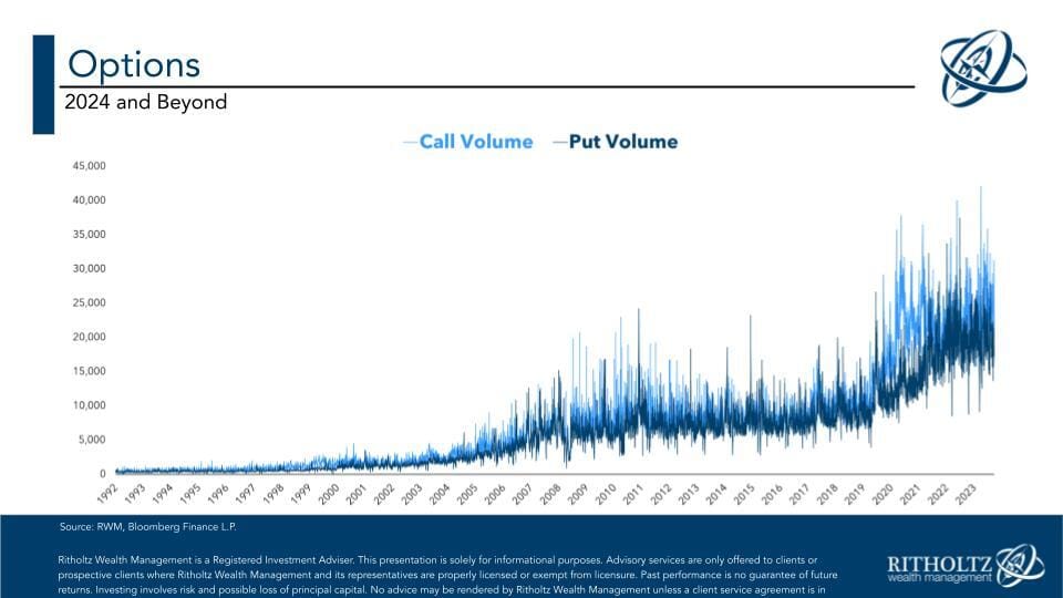 Chart: From 92’ - 23’ the CAGR for call volume is 12% and the CAGR for Put volume is 13% (for comparison, the S&P 500 has a CAGR of 8% during the same time period)