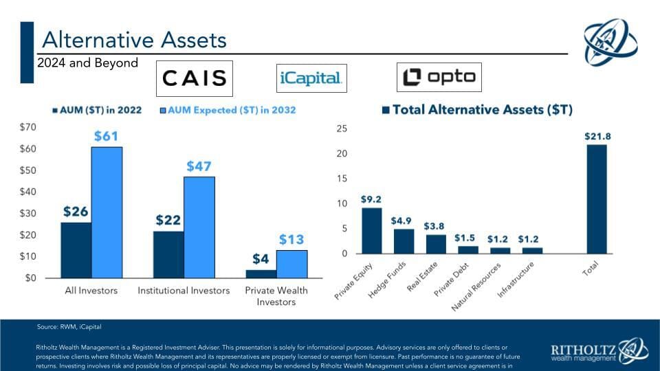 Out of total investable assets, alts hit a record 15.5% of assets in 2022, but fell down to 14.9% in 2023.