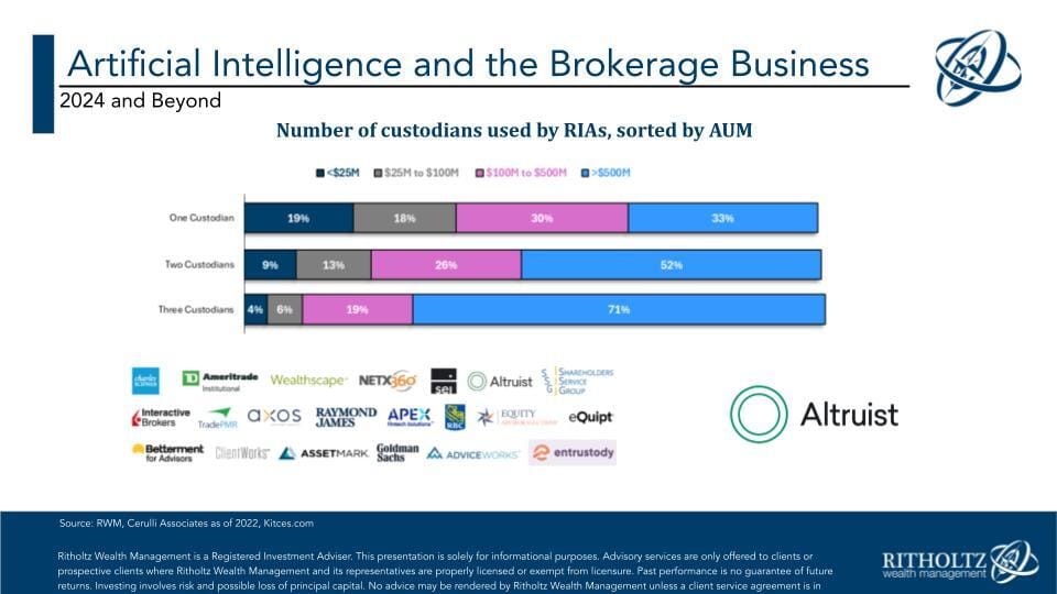 Too early! I didn’t have a lot to say on AI in retail or advisor-directed brokerage accounts but my assumption is that every custodian / broker on this slide is working on incorporating these tools and by this time next year, there will be plenty to say. Altruist gets a special call-out here because they are defining the category of next-gen custody solutions for advisors and seem to the most technology-forward platform in our space right now.