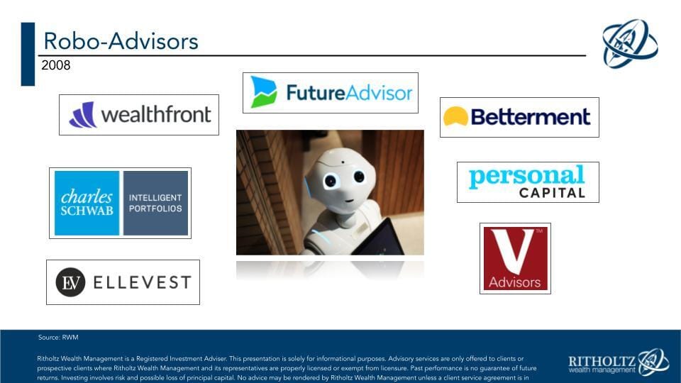 In the wake of the financial crisis, a new innovation came along that offered advice for this generation so they wouldn’t have to begin their portfolios alone. Traditional Wall Street firms had no interest in serving millennials with less than $100,000 in liquid assets. The only financial advisors who were interested in helping them were insurance company advisors who wanted to sell them annuities or independent broker-dealers who wanted to sell them high-cost, front-loaded mutual funds. There was no good wealth management solution for the millennials until the concept of robo-advice came along.