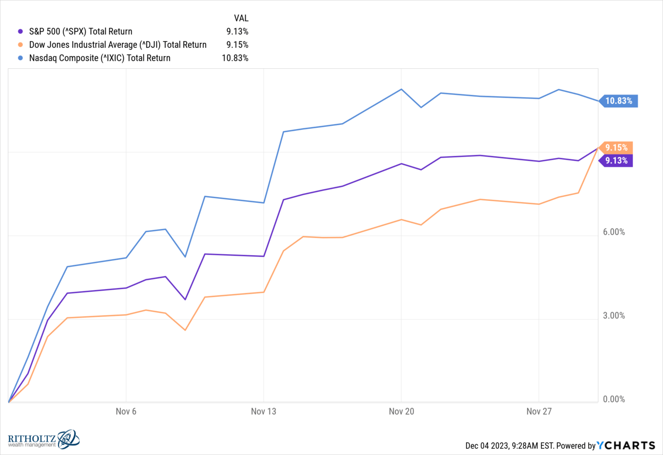 November 2023 will go down in history as having been one of the best stock market months ever. The Dow Jones and S&P 500 did 9% and the Nasdaq did 11%.
