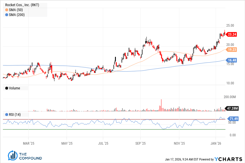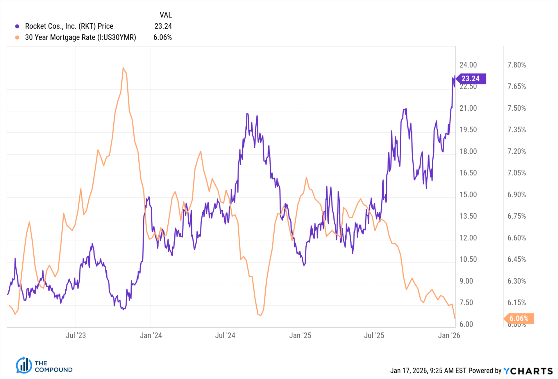 I’ll show you one we haven’t talked about in awhile. I don’t know if you remember a few months back I had the CEO of Rocket Companies, Varun Krishna, on Live from The Compound. He was great. Rocket has built America’s killer refi machine. Varun called it an engine. Rocket has ten percent market share in refi, nationwide. And while mortgage rates sucked this past year, he made two critical acquisitions to prepare for the turn - first, he bought Redfin, a leading real estate portal on the internet for both house-hunters and the brokers in search of them. Then they closed their acquisition of Mr. Cooper, the largest standalone mortgage servicing platform in the country. These deals gave Rocket an end-to-end answer for consumers, from finding the house to applying for a loan to closing on the property to making mortgage payments. They are now dominating the mortgage business and the mortgage business is coming back to life.