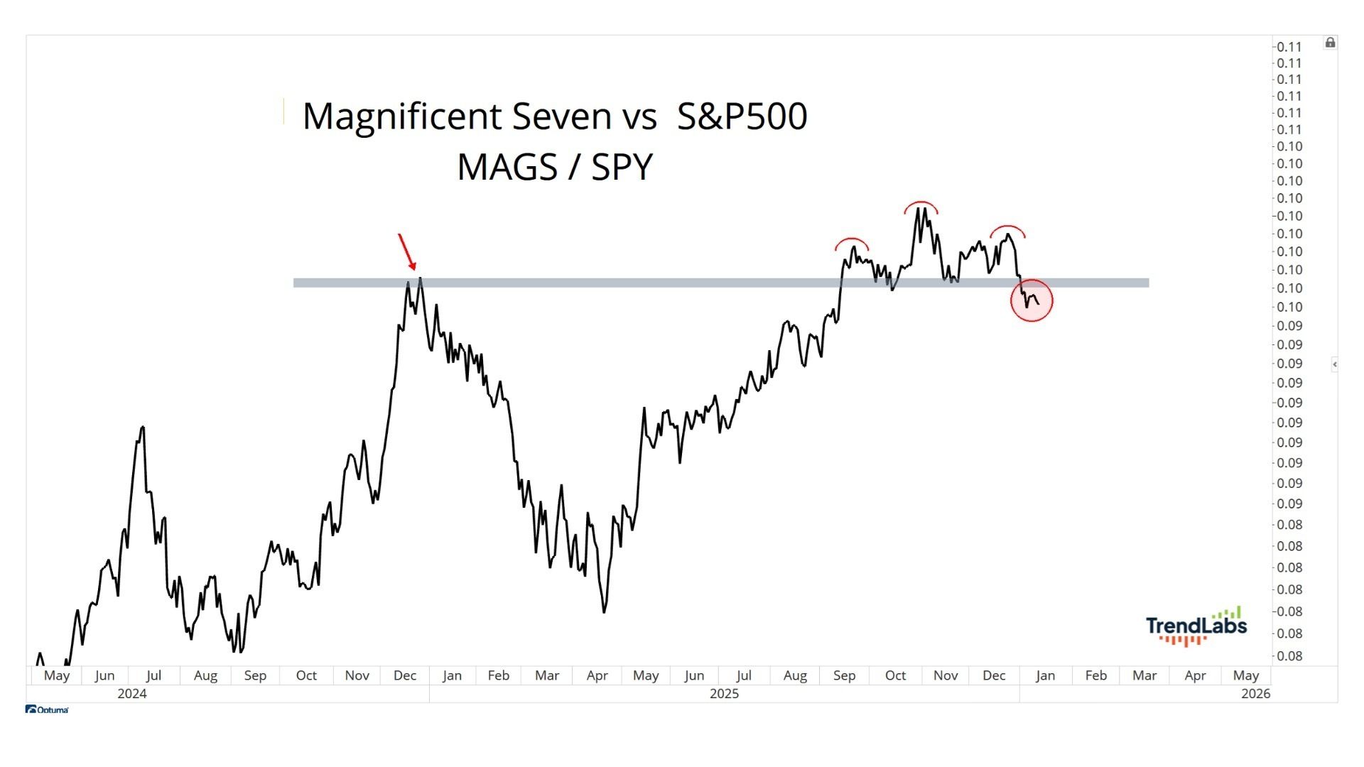 What you’re looking at above is a great example of a phenomenon I want to teach you about today. It’s a chart from my friend JC Parets at TrendLabs who points out that, contra to all the bubble talk in the stock market surrounding AI capex, the companies building the data centers actually saw their share prices peak relative to the rest of the stock market way back in October. They stopped going up a long time ago, with the exception of Alphabet (GOOGL). This is a ratio chart of Magnificent 7 stocks (colloquially, “the AI Trade”) versus the SPY ETF. Could be noise and a false breakdown - or the start of a larger roll-over. We’re watching it.